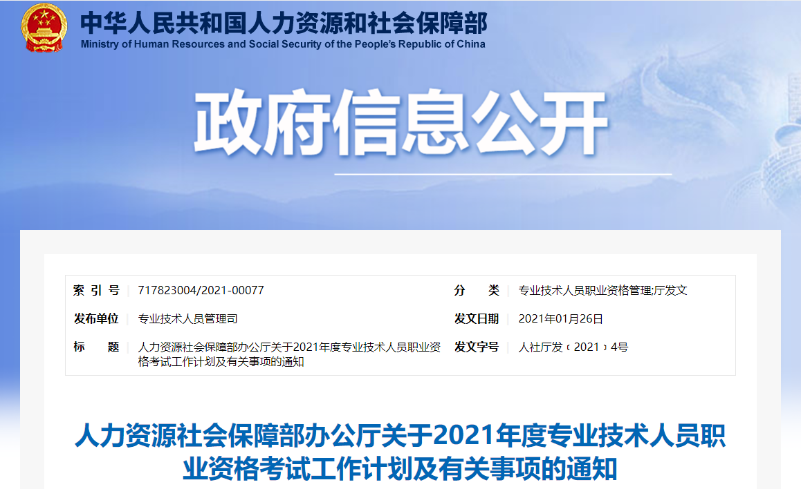 人力资源社会保障部办公厅关于2021年度专业技术人员职业资格考试工作计划及有关事项的通知,具体通知如下:
